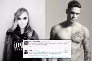 "@GazGShore la batalla aún no ha empezado, pero ya he ganado la guerra! ¿Estás preparado para el reto?" a lo que contestó Gaz: "@Caradelevingne el próximo domingo tu trasero será mío, espero que no seas una mala perdedora".