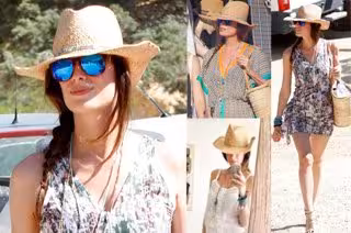 Entre los días de sol y playa ha lucido un moderno vestido de tirantes corto con estampado étnico que dejaba entrever su incipiente barriguita. También lucía un sombrero de paja para protegerse del sol a juego con su capacho, así como unas modernas sandalias de cuña.