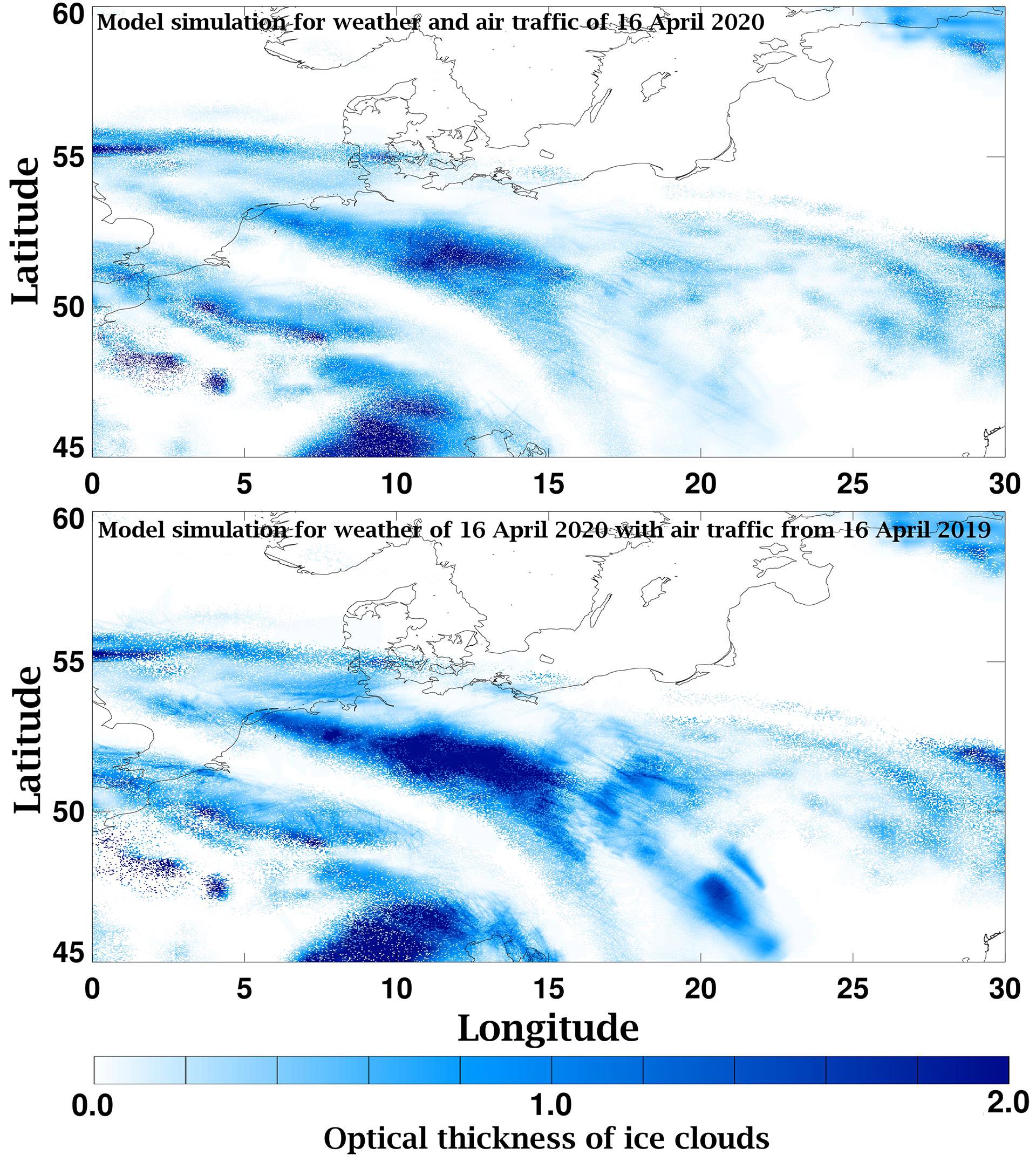 Además, los científicos utilizaron el modelo para calcular un escenario con un volumen de tráfico aéreo 10 veces mayor, como habría sido el mismo día en 2019, con las condiciones meteorológicas mantenidas iguales para determinar el efecto de los niveles de tráfico solo . Los cálculos muestran claramente una cobertura mucho mayor de las nubes cirrus de estela, con un mayor grosor óptico de las nubes de hielo. Ponderado con los espesores ópticos, el grado de cobertura de las estelas parcialmente superpuestas sería cuatro veces mayor.