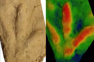 Una de las huellas parecidas a pájaros de Maphutseng, Lesotho (izquierda), y un mapa de profundidad en colores falsos de la impresión (derecha)
