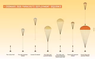 Unos 20 segundos después, a unos 400 km/h, se abrirá el segundo paracaídas. Después de la separación de los paracaídas a aproximadamente 1 kilómetro por encima del suelo, los motores de frenado se activarán para entregar de forma segura una plataforma de aterrizaje, con un rover encapsulado dentro, en la superficie de Marte para su misión científica. La secuencia completa desde la entrada a la atmósfera hasta el aterrizaje dura solo seis minutos.