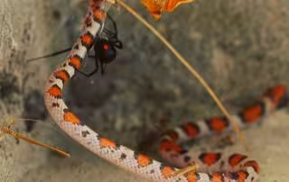 Las viudas negras de la familia Theridiidae fueron las cazadoras de serpientes exitosas en aproximadamente la mitad de todos los incidentes observados. Su potente veneno contiene una toxina que se dirige específicamente al sistema nervioso de los vertebrados. Estas arañas construyen telas compuestas de seda extremadamente resistente, lo que les permite capturar animales de presa más grandes como lagartos, ranas, ratones, pájaros y serpientes.
