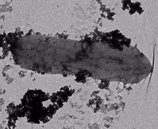 Esta célula de Geobacter, que se parece un poco a un maní gris en esta imagen de microscopio, está moteada con una capa oscura de minerales de cobalto que serían tóxicos para muchos organismos. - HUNTER DULAY.