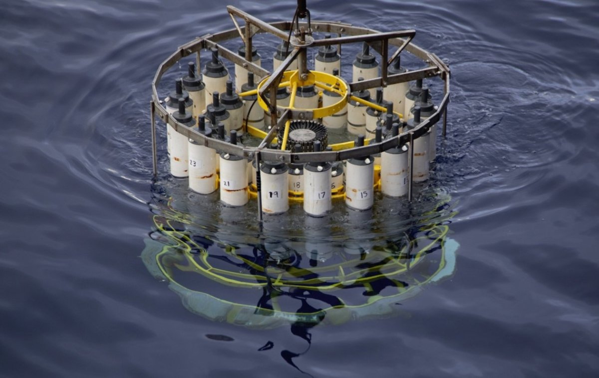 Una roseta de conductividad, temperatura y profundidad (CTD) utilizada para tomar muestras de agua de la zona crepuscular del océano durante una expedición GEOTRACES en el Océano Pacífico.