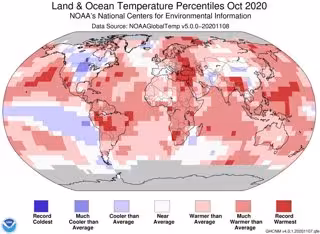 La temperatura global promedio de la superficie terrestre y oceánica para octubre de 2020 fue de 0,85 grados Celsius por encima del promedio del siglo XX y la cuarta temperatura más alta de octubre en el récord de 141 años.