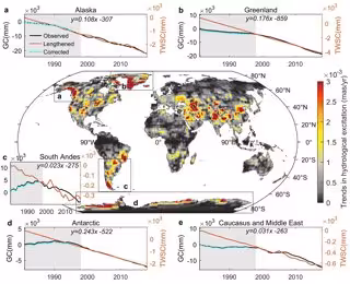 El derretimiento de los glaciares en Alaska, Groenlandia, Andes del sur, Antártida, Cáucaso y Medio Oriente se aceleró a mitad de la década de 1990, convirtiéndose en el principal impulsor de los polos de la Tierra en una  deriva repentina y rápida