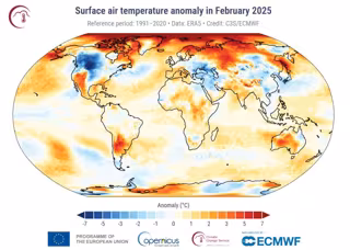 Febrero de 2025 fue el tercer febrero más cálido a nivel mundial, con una temperatura media del aire en superficie de 13,36 °C, 0,63 °C por encima de la media de febrero de 1991-2020, y solo marginalmente más cálida, en 0,03 °C, que el cuarto febrero más cálido de 2020.