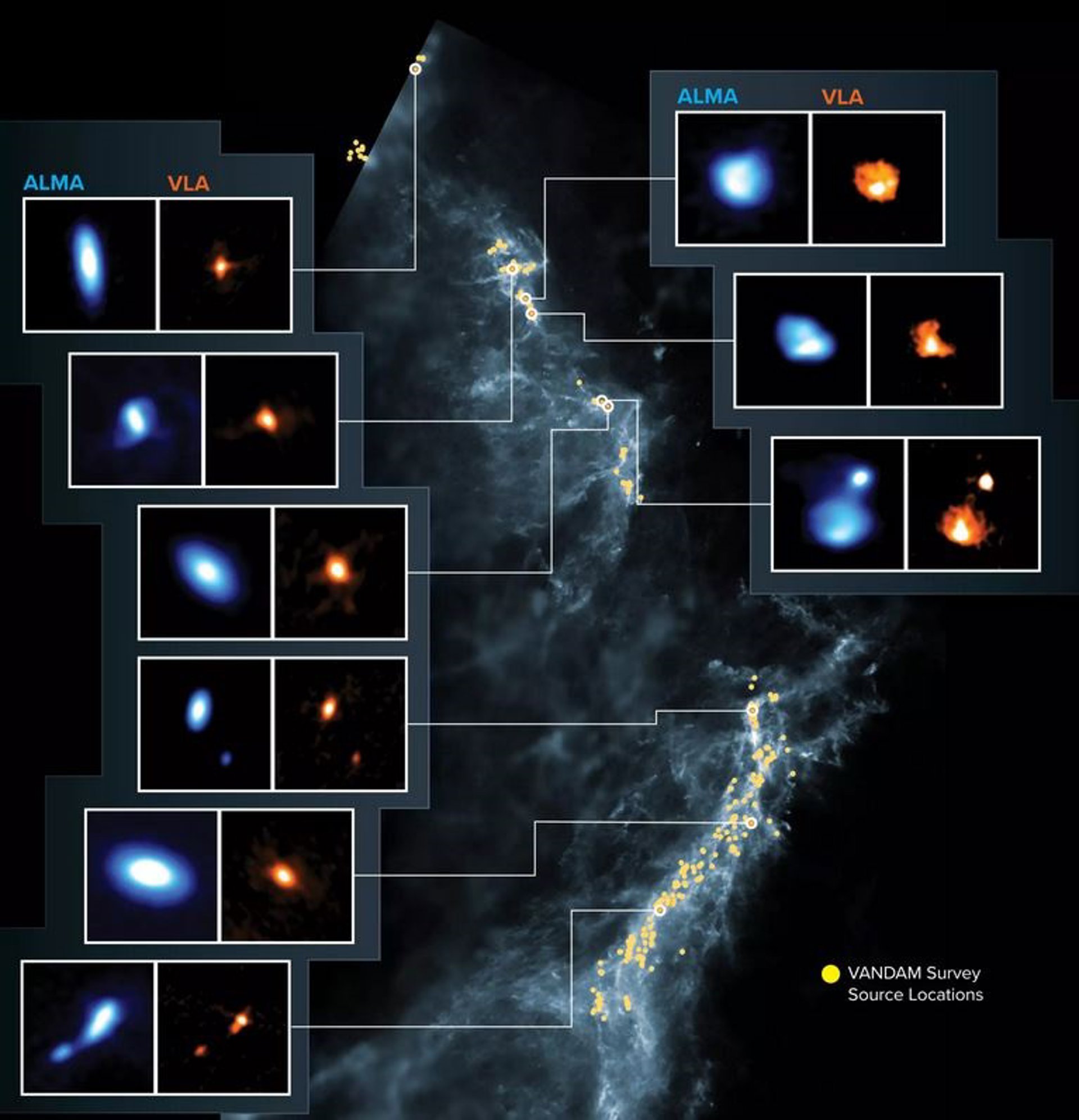 En este nuevo estudio, los astrónomos apuntaron el Atacama Large Millimeter/submillimeter Array (ALMA) y el Karl G. Jansky Very Large Array (VLA) a una región donde se forman muchas estrellas: las nubes moleculares de Orión. Se trata del estudio de estrellas y sus respectivos discos más ambicioso que se haya emprendido a la fecha, y se lo bautizó como VLA/ALMA Nascent Disk and Multiplicity (VANDAM).