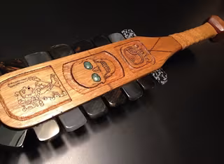 Una reproducción moderna de un macuahuitl azteca (mixteco), utilizado como una combinación de espada y garrote, al que se le dieron bordes cortantes y violentos al agregarle fragmentos de obsidiana a los costados.
