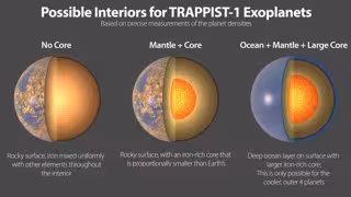 Los autores del estudio plantean tres hipótesis para explicar esta diferencia de densidad con nuestro planeta. La primera implica una composición similar a la de la Tierra, pero con un porcentaje menor de hierro (alrededor del 21% frente al 32% de la Tierra). Dado que la mayor parte del hierro en la composición de la Tierra se encuentra en el núcleo de la Tierra, este agotamiento de hierro de los planetas TRAPPIST-1 podría indicar núcleos con masas relativas más bajas. La segunda hipótesis implica composiciones enriquecidas con oxígeno en comparación con la de nuestro planeta. Al reaccionar con el hierro, el oxígeno formaría óxido de hierro, más conocido como "óxido". La superficie de Marte obtiene su color rojo del óxido de hierro, pero al igual que sus tres hermanas terrestres (Tierra, Mercurio y Venus), tiene un núcleo de hierro no oxidado. Sin embargo, si la menor densidad de los planetas TRAPPIST-1 se debiera por completo al hierro oxidado, entonces los planetas estarían 'oxidados hasta el corazón' y podrían no tener un núcleo real, a diferencia de la Tierra. Según Eric Agol, astrofísico de la Universidad de Washington y autor principal, la respuesta podría ser una combinación de ambos escenarios: menos hierro en general y algo de hierro oxidado.