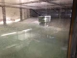 Pronto, las gotitas de aerosol se dispersan a través de los lados del tanque con estructura de acero y un modelo en miniatura de una casa verde y blanca se empapa por las olas que se asemejan a una oleada provocada por una tormenta de la vida real cuando agrede una propiedad costera.
