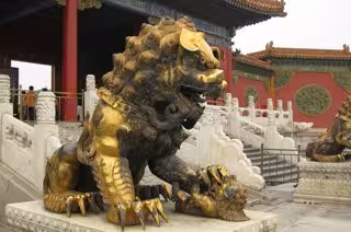 Un león guardián dorado frente al Palacio de la Longevidad Tranquila. Ciudad Prohibida de Pekín - WIKIPEDIA