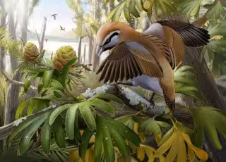 Reconstrucción de Brevirostruavis macrohyoideus con la boca abierta para mostrar su lengua larga que se usaba para atrapar insectos u obtener néctar de plantas con cono.