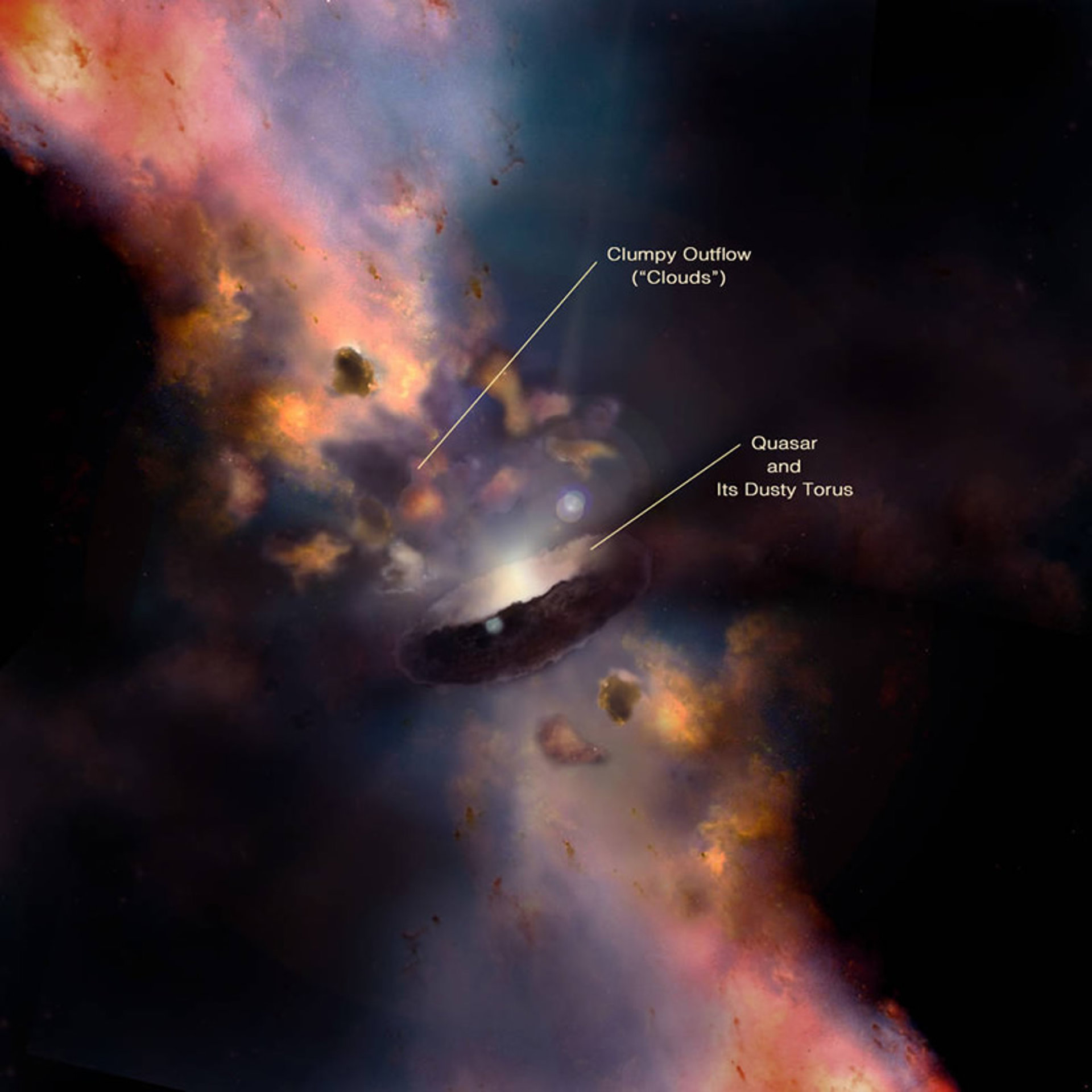 Este modelo solo mira la capa de gas, no el disco de material que gira alrededor del agujero negro que lo alimenta. El siguiente paso de los investigadores es examinar si el flujo de gas se origina en el propio disco. También están interesados en abordar el misterio de por qué algunas nubes se mueven extremadamente rápido, del orden de 10.000 kilómetros por segundo.