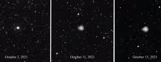 "Inicialmente parecía un objeto compacto y brillante", dice Eliot Herman, el astrónomo que detectó y ha estado monitoreando el evento, citado por Spaceweather.com . "Ahora la nube en expansión tiene 1,3 minutos de arco de ancho (más grande que Júpiter) y es lo suficientemente transparente para que brillen las estrellas de fondo".