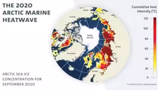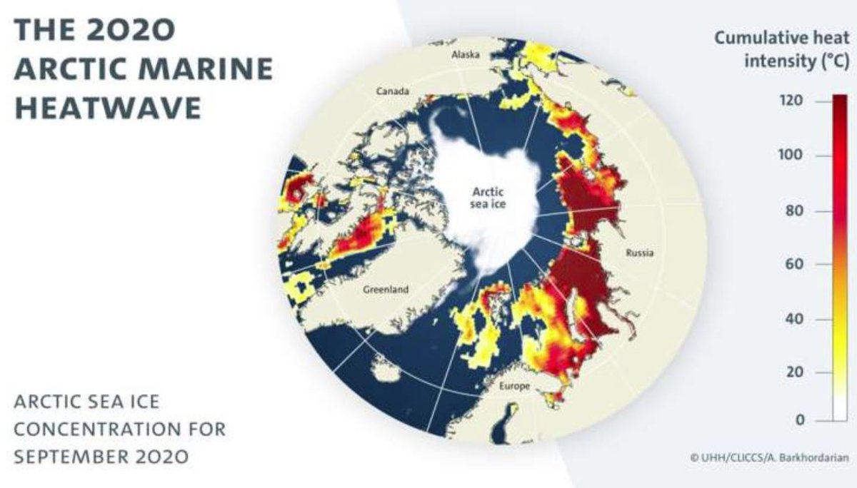 La figura muestra la ola de calor más poderosa registrada en el Océano Ártico hasta la fecha en 2020, que duró 103 días.