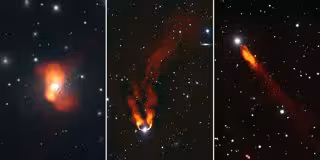 A la derecha, los chorros de la galaxia IC 310 están doblados hacia atrás, de manera similar a NGC 1265, pero parecen más cercanos debido al ángulo de visión desde la Tierra. Ese ángulo también permite a los astrónomos observar directamente los rayos gamma energéticos generados cerca del agujero negro supermasivo en el núcleo de la galaxia.
