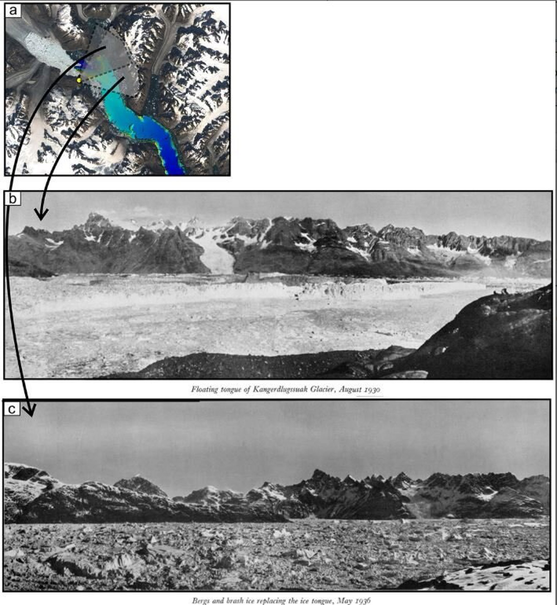 La única razón por la que los científicos saben hoy sobre el dramático retiro del glaciar Kangerlussuaq en la década de 1930 es la existencia de fotografías aéreas y terrestres tomadas por exploradores antes y después de que la lengua del glaciar se hubiera desprendido de una cresta submarina.