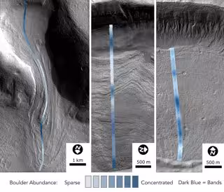 Al elegir 45 glaciares para examinar, Levy adquirió imágenes de alta resolución recopiladas por el satélite Mars Reconnaissance Orbiter y se dispuso a contar el tamaño y la cantidad de rocas. Con una resolución de 25 centímetros por píxel, "puedes ver cosas del tamaño de una mesa", dice Levy.