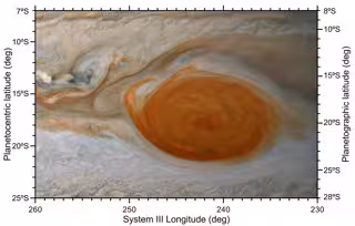 Nubes rojas se desprenden de la Gran Mancha Roja de Júpiter durante un encuentro con un anticiclón más pequeño, como lo vio la JunoCam de alta resolución de la nave espacial Juno el 12 de febrero de 2019. - AGU/JOURNAL OF GEOPHYSICAL RESEARCH: PLANETS