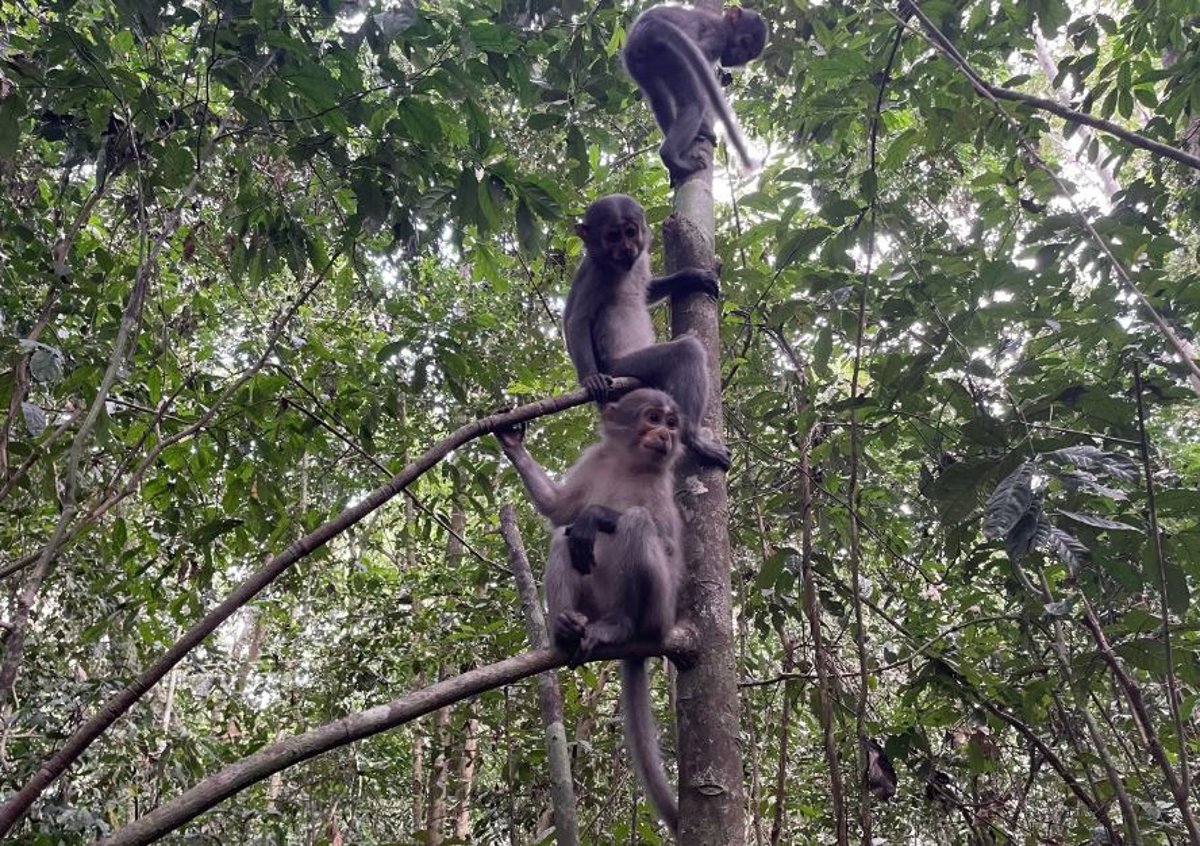 Los simios y los primeros humanos desarrollaron brazos más flexibles que los monos, como los mangabeys que se muestran aquí, para salir de los árboles con seguridad. - LUKE FANNIN