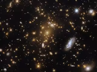 La enorme masa de este leviatán cósmico curva el espacio-tiempo, creando una lente gravitatoria que desvía la luz de galaxias distantes más allá del cúmulo. Las rayas retorcidas y los arcos de luz que vemos en esta imagen son el resultado. Una multitud de otras galaxias rodea el cúmulo, y un puñado de estrellas en primer plano con picos de difracción reveladores se encuentran dispersos por toda la imagen, explica la NASA en un comunicado.