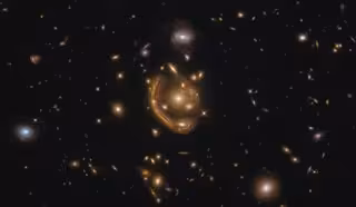 En este caso, la luz de la galaxia de fondo se ha distorsionado en la curva que vemos por la gravedad del cúmulo de galaxias que se encuentra frente a ella. La alineación casi exacta de la galaxia de fondo con la galaxia elíptica central del cúmulo, que se ve en el medio de esta imagen, ha deformado y ampliado la imagen de la galaxia de fondo en un anillo casi perfecto. La gravedad de otras galaxias del cúmulo provoca distorsiones adicionales.
