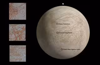 Tres imágenes recientemente reprocesadas, tomadas por la nave espacial Galileo de la NASA a fines de la década de 1990, revelan detalles en diversas características de la superficie en la luna Europa de Júpiter. Un paisaje muy variado, que incluye crestas, bandas, pequeñas cúpulas redondeadas y espacios interrumpidos que los geólogos llaman "terreno del caos".
