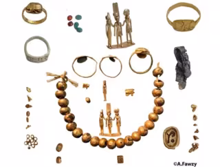 La misión encontró estas joyas dentro de una pequeña vasija de cerámica rota, pero estaba completa en sus partes, y todas las piezas de joyería estaban en buen estado de conservación. La colección de joyas incluye anillos hechos de oro y metales, pequeños amuletos de oro, incluida una estatua triple de los antiguos dioses egipcios Amón, Mut y Khonsu, además de un broche de metal, amuletos que representan a los dioses en formas de animales y una gran cantidad de cuentas, algunas de ellas chapadas en oro.