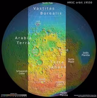 Las llanuras rojizas de Arabia Terra y Terra Sabaea en el centro de la imagen son notables por la presencia de muchos grandes cráteres de impacto, lo que indica que se encuentran entre las regiones más antiguas de Marte. A lo largo de su frontera norte hay una escarpa sorprendente, con una diferencia de varios kilómetros de altura. Esto separa las llanuras planas, apenas con cráteres de las tierras bajas del norte de las tierras altas del sur, que tienen muchos más cráteres. Este cambio notable en el terreno, conocido como la dicotomía marciana, marca una división topográfica y regional fundamental en Marte.