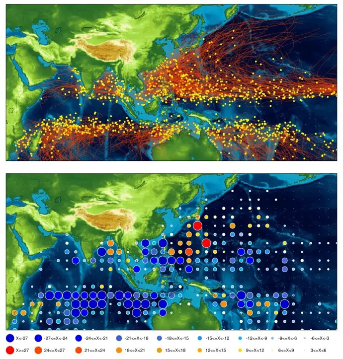 Arriba se muestran las localizaciones de la génesis de ciclones tropicales y sus trayectorias según las condiciones actuales. Abajo, se simulan cambios en la densidad de ciclones con el doble de CO2 en la atmósfera