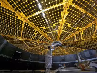 Una vez que los paneles solares de la nave espacial Lucy estén conectados y completamente extendidos, podrían cubrir un edificio de cinco pisos.
