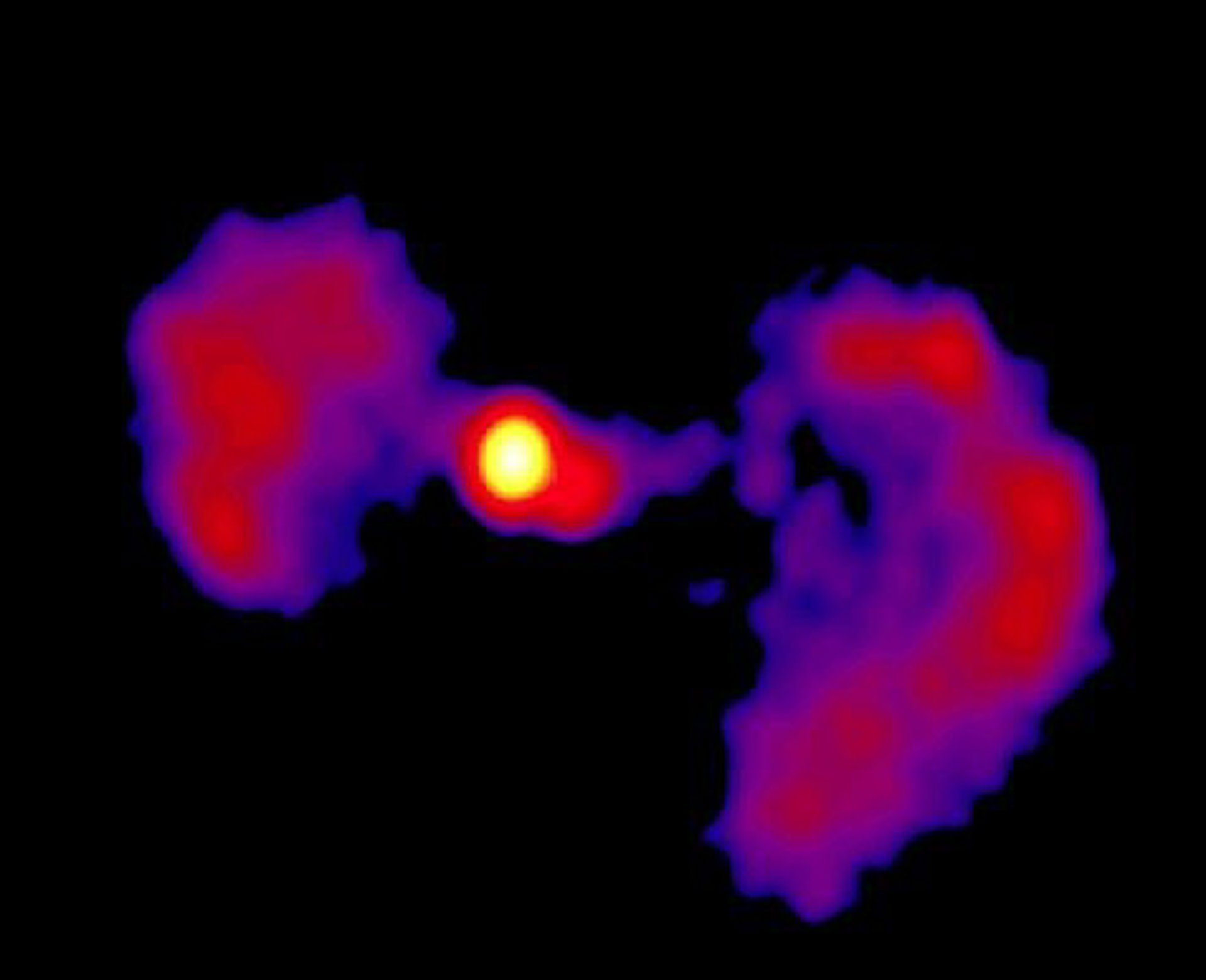 Si la galaxia estuviera alineada de modo que los chorros y los lóbulos fueran perpendiculares a nuestra línea de visión, toda la luz llegaría a la Tierra al mismo tiempo. Veríamos a ambos lados en la misma etapa de desarrollo, que es en realidad.