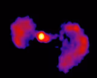 En algunos casos, las colisiones con gas intergaláctico tenue eventualmente ralentizan y detienen el movimiento hacia afuera de las partículas en chorro, y el material comienza a fluir hacia el centro de la galaxia. Esto da como resultado regiones amplias, o lóbulos, llenos de partículas de movimiento rápido que giran en espiral alrededor de campos magnéticos. Las interacciones de las partículas crean una emisión de radio brillante.