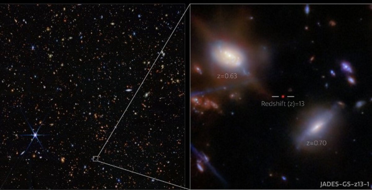 Observaciones en infrarojo con el telescopio espacial Webb han revelado la increíblemente distante galaxia JADES-GS-z13-1, observada a tan solo 330 millones de años después del Big Bang, en imágenes tomadas por la NIRCam (Cámara de Infrarrojo Cercano) del Webb como parte del programa JADES.