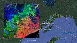 ECOSTRESS, acoplado al casco de la Estación Espacial Internacional puede ver cuándo las plantas "despiertan" y comienzan estos procesos desde el espacio. La imagen de arriba muestra las plantas despertando (como lo demuestra la evapotranspiración) al oeste del Lago Superior, cerca de la frontera entre Estados Unidos y Canadá. Las plantas en las áreas rojas y rosadas comenzaron a despertar alrededor de las 7 a.m., hora local. Aquellos en áreas verdes se despertaron más cerca de las 8 a.m., y aquellos en áreas azules, más cerca de las 9 a.m.