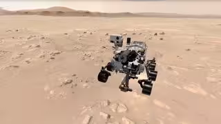 El rover Mars Perseverance de la NASA se muestra en su lugar de aterrizaje en el cráter Jezero en esta vista de la experiencia web 3D "Explora con Perseverance".