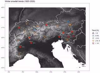 "La tendencia en términos de nevadas recientes en los Alpes es marcadamente negativa, con un descenso general de alrededor del 34 %. En particular, se observó un descenso notable a partir de 1980. Esta fecha también coincide con un aumento igualmente pronunciado de las temperaturas", explica Michele Bozzoli, meteorólogo medioambiental de Eurac Research y primer autor del estudio. "Las tendencias más negativas se dan en las zonas por debajo de los 2.000 metros de altitud y se dan en las regiones meridionales, como Italia, Eslovenia y parte de los Alpes austríacos.