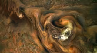 Esta vista de la nave espacial Juno de la NASA captura patrones coloridos e intrincados en una región de corriente en chorro del hemisferio norte de Júpiter conocida como "Jet N3".