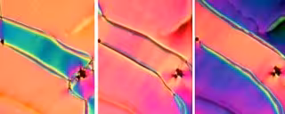 Cuando el equipo de Clark intentó observar esa extraña fase bajo el microscopio, notaron algo nuevo. Bajo un campo eléctrico débil, se desarrolló una paleta de colores llamativos hacia los bordes de la celda que contiene el cristal líquido.