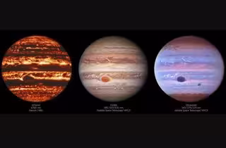 La Gran Mancha Roja del planeta, el famoso sistema de tormentas persistentes lo suficientemente grande como para tragarse la Tierra entera, es una característica destacada de las imágenes visible y ultravioleta, pero es casi invisible en longitudes de onda infrarrojas. Las bandas de nubes contrarrotantes de Júpiter, por el contrario, son claramente visibles en las tres vistas.