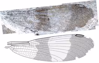 Ala de la nueva especie Okanagrion hobani, del sitio fósil de McAbee en Columbia Británica, un insecto con forma de caballito del diablo del nuevo suborden Cephalozygoptera