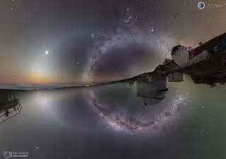 En la parte superior de la imagen, el Observatorio del Roque de los Muchachos (Garafía, La Palma), tomada en febrero de 2020. La zona inferior refleja el cielo del hemisferio sur desde el Observatorio La Silla (ESO Astronomy), en abril de 2016. - FLCKR/PETER HORALEK/JUAN CARLOS CASADO