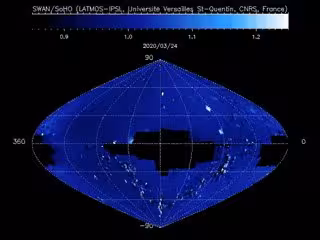 SWAN mapea el viento solar que fluye constantemente en el espacio interplanetario al enfocarse en una longitud de onda particular de luz ultravioleta emitida por los átomos de hidrógeno. El nuevo cometa, oficialmente clasificado C/2020 F8 (SWAN) pero apodado Cometa SWAN, fue visto en las imágenes porque libera enormes cantidades de agua, aproximadamente 1,3 toneladas por segundo. Como el agua está hecha de hidrógeno y oxígeno, este lanzamiento hizo que el cometa SWAN fuera visible para los instrumentos de SOHO.