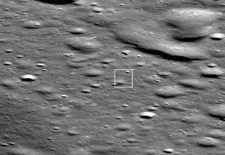 El módulo de aterrizaje lunar Blue Ghost Mission 1 de Firefly Aerospace, que aparece en esta imagen del Lunar Reconnaissance Orbiter de la NASA como un píxel brillante que proyecta una sombra en el centro del cuadro blanco, - NASA/GODDARD/ARIZONA STATE UNIVERSITY