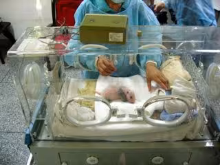 De color rosa, ciegos e indefensos, los pandas gigantes suelen pesar unos 100 gramos al nacer, el equivalente a una barra de mantequilla. Sus madres son 900 veces más masivas que eso.
