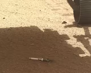 Un tubo de titanio que contiene una muestra de roca descansa sobre la superficie de Marte tras ser depositado allí el 21 de diciembre por el rover Perseverance de la NASA.