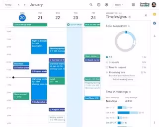 El Calendario de Google ha introducido la nueva función Time Insights, con informes detallados que permiten al usuario conocer el porcentaje de tiempo diario o semanal que suponen las reuniones sobre su jornada total.