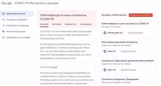 La página de Google sobre el COVID-19 ofrece un 'hub' centralizado en el que se incluyen por un lado información pública del Gobierno de España y de la Organización Mundial de la Salud (OMS) sobre la prevención del COVID-19, información sobre los síntomas y los lugares oficiales para pedir ayuda.