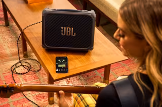 BandBox Solo, de tamaño compacto, incluye una entrada para guitarra o micrófono y da acceso a varias funciones desde la 'app' JBL ONE, como la posibilidad de elegir entre modelos de amplificadores vintage o modernos y efectos como la modulación, el coro y la reverberación sin necesidad de pedales.